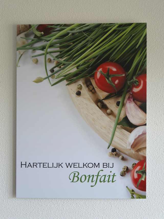 Bonfait is een bedrijf dat mooie, verse kant-en-klaarmaaltijden, soepen en sauzen levert: Een feestje op het bord van de klant. Ook biedt Bonfait vele mogelijkheden voor versspeciaalzaken, groothandels, zorginstellingen en horeca. Het grote pand van Bonfait is dan ook vanaf de intree fraai gedecoreerd met prachtige foto's verlijmd op dibond. Een feestje voor het oog! Op de foto's zie je de producten zelf, van zaaien tot oogsten en eten. Heel smakelijk! De vele opvallende foto's hebben in de gangen en de kantoorruimtes een prachtige plek gekregen.