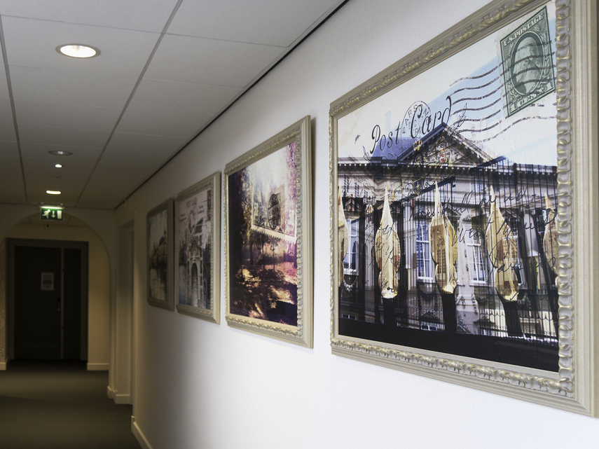 Residence Haganum in Den Haag biedt alle faciliteiten om volledig tot rust te komen en te herstellen na bijvoorbeeld een ziekenhuisopname of bij revalidatie. Ontwerpbureau All in Living heeft gezorgd voor een gastvrije, vriendelijke, warme sfeer in het hotel. De foto's op canvas in diverse mooie grote lijsten - geleverd door Star Frame - passen hier perfect bij. Op het canvas zijn de eigen ontwerpen van All in Living geprint, die allen betrekking hebben op Den Haag. Ook dit past prachtig bij de gekozen sfeer en kleuren.