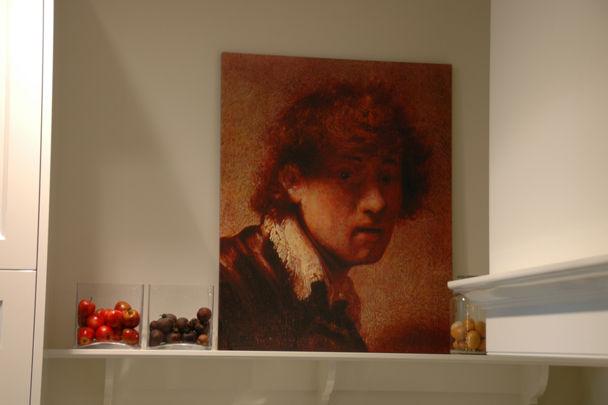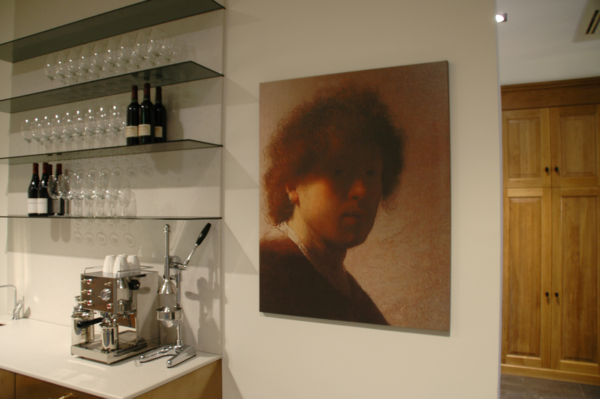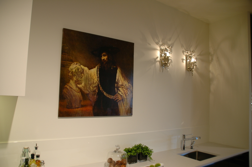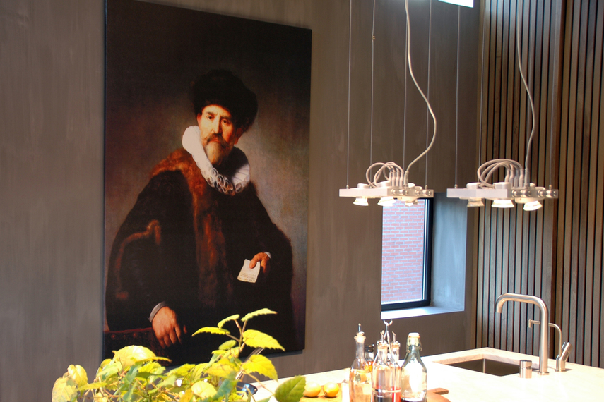 beeldbank. In de meeste gevallen kiezen klanten ervoor om de oude meesters op ons hoogwaardige EPSON canvas te laten afdrukken om ze vervolgens van een of enkele vernislagen te voorzien. Op de foto's ziet u hoe de zeer moderne showroom van Lodder Keukens in Barneveld een perfect decor vormt voor zo'n serie oude meesters op