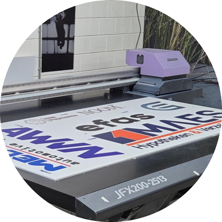Een zeer bijzondere vaste klant werd in 2023 Logoaandemuur.nl, een intitiatief van ontwerper/entrepeneur David de Jong uit Kampen. Voor David verwerken wij maandelijks vele tientallen logo's op diverse materialen. Meest gebruikt is forex 8 millimeter dik. Eerst printen wij de logo's op de gewenste grootte op de plaat op onze Mimaki vlakbedprinter, daarna worden de ligo's zorgvuldig gefreesd op onze Summa snij- en freesmachine.