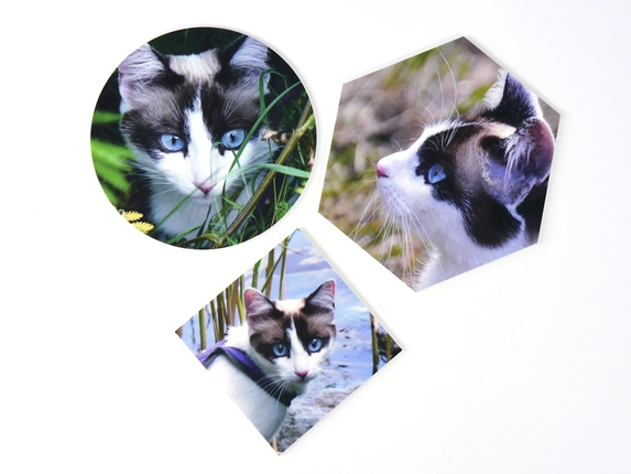 Want to display your photo in a more original way? Choose wall decoration in shape – precisely cut contours such as circle, oval (portrait or landscape), heart shape, square or hexagons. At Photogift we produce each shape to the millimetre, printed in high resolution and finished with professional precision.